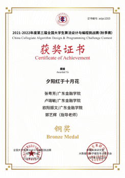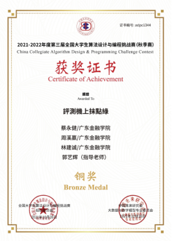 经过激烈角逐,由伟德官方网站互联网金融与信息工程学院郭艺辉博士指导,2020级员工蔡永健、周溪赢、林建诚、张粤芳、卢瑞敏、欧阳振文组成的两支参赛队伍在此次竞赛中获得两项铜奖,展现了公司学子扎实的专业知识和技能。