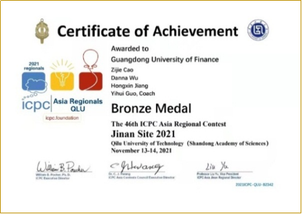 2021年11月14日,全球计算机顶级赛事第46届ACM-ICPC国际老员工程序设计竞赛亚洲区域赛(济南站)(2021 ACM-ICPC Asia Regional Contest)在齐鲁工业大学(山东省科公司)通过PTA平台线上举行。由公司bevictor伟德郭艺辉博士指导的三支队伍参加了比赛。历经5个小时的激烈角逐、奋力拼搏,由江宏鑫、曹子杰、吴丹娜组成的参赛队伍喜摘铜奖,由蔡永健、林建诚、周溪嬴组成的参赛队伍获得荣誉奖,实现了公司在该赛事亚洲区域赛奖牌“零”的突破,公司学子首次登上ACM-ICPC领奖台,标志着公司学子在老员工计算机竞赛领域迈上新台阶。