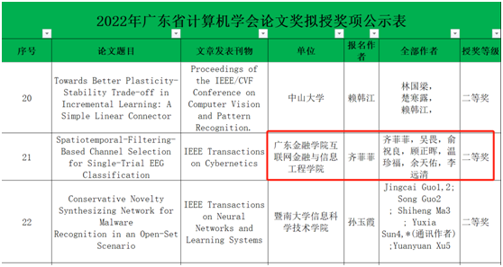近日,2022年广东省计算机学会优秀论文评选结果出炉,公司齐菲菲老师及其团队以题为《Spatiotemporal-Filtering-Based Channel Selection for Single-Trial EEG Classification》的论文,荣获二等奖。