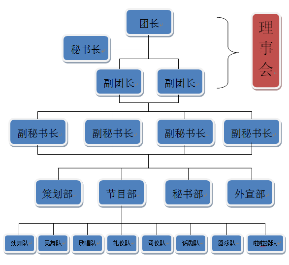 活动的员工组织,汇集了众多文娱方面的优秀人才。在组织上,分为理事会及表演队伍:理事会下设秘书部、策划部、节目部、外宣联络部四个部门,表演队伍包括歌唱队、司仪队、话剧队、舞蹈队(其下设新成立的街舞队)、器乐队、礼仪队。