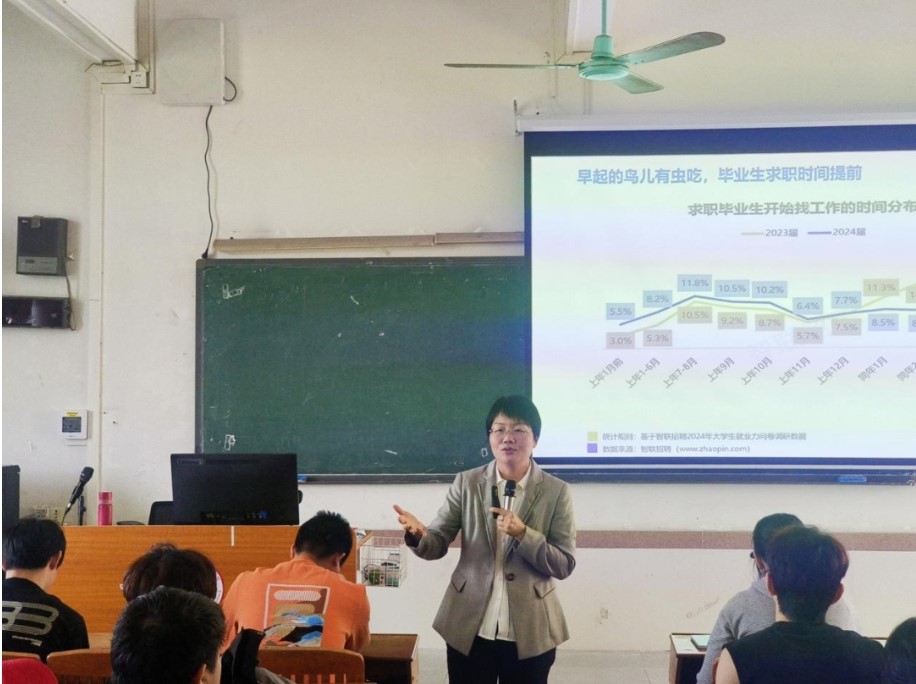 何老师以生动的案例和幽默的语言,深入剖析了当前就业市场的现状和发展趋势。她指出,随着社会经济的快速发展,新兴行业不断涌现,传统行业也在转型升级,这既为求职者带来了更多的机遇,也提出了更高的要求。她强调,同学们需培养复合能力,既深耕专业领域,又拓展跨界思维,建议通过实习、行业调研等方式主动探索职业边界。