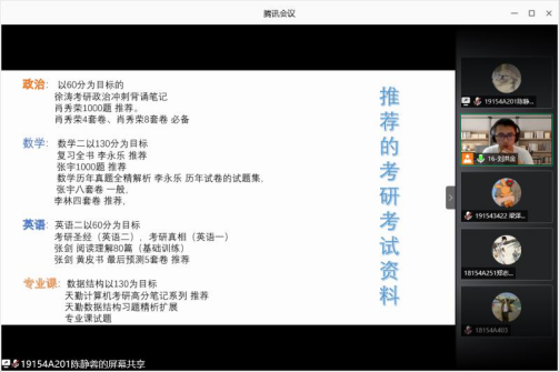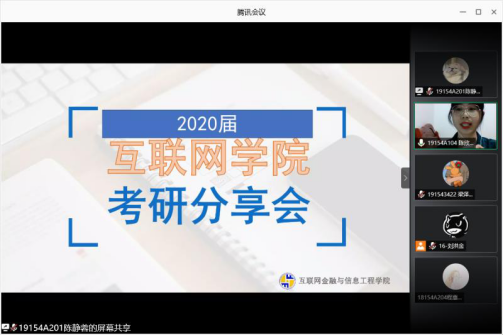 6月27日,公司在腾讯会议平台举办考研分享交流会。公司党总支副书记丘志君、辅导员钟培权、辅导员陈兴出席了会议,2020届考研成功优秀毕业生陈彩凤蔡浩锋刘洪金莫咏莹和李浩彬应邀与80多名师弟师妹分享交流考研经验和方法,会议由陈欣瑄同学主持。