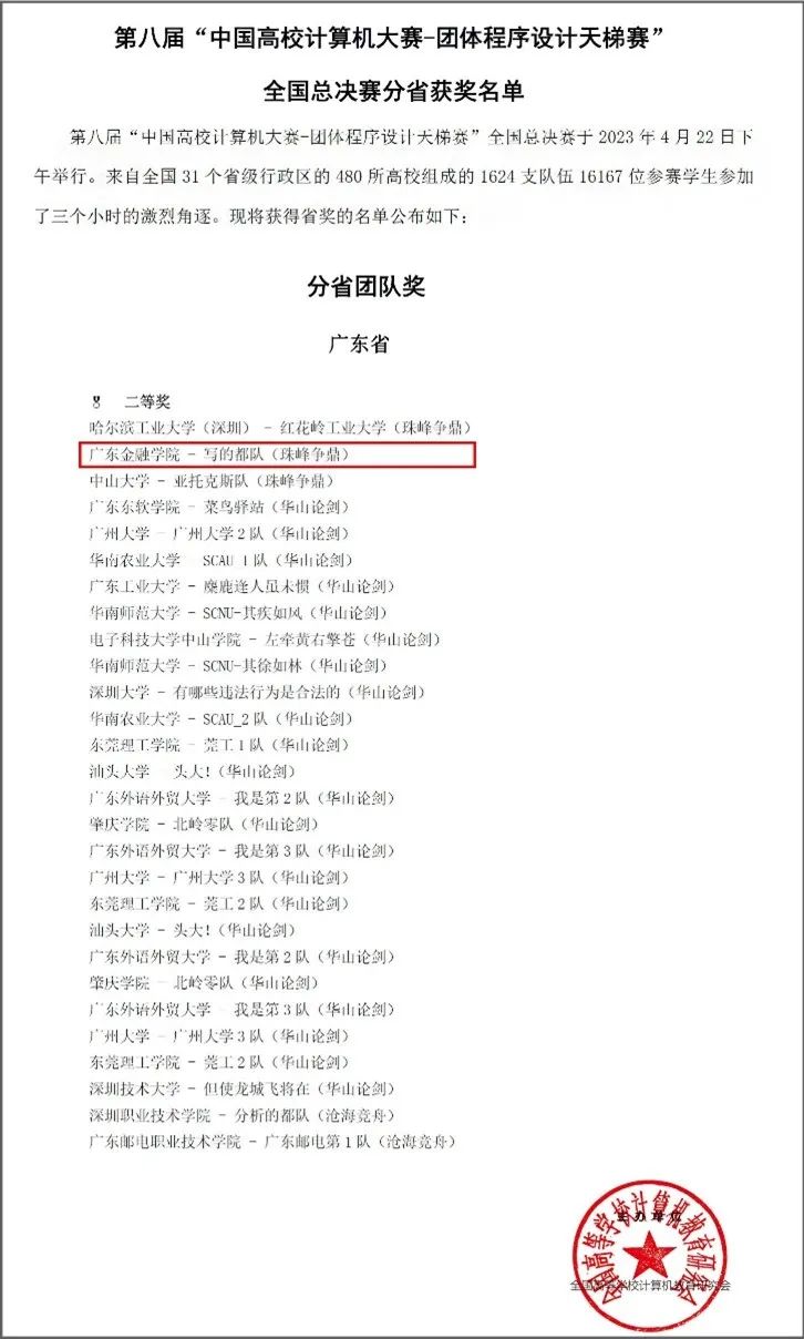 公司bevictor伟德员工徐展鹏、廖斌锴、杨煌、谢李贝蕾、曹家豪、胡主艳、陈萃薇、陈思涛、陈欣琳及汤雨杭等10位同学组队“写的都队”队参加了难度最大、级别最高的珠峰争鼎组比赛。经过激烈角逐,公司喜获两个奖项:(1)团队获得广东省团队二等奖(二等奖组别总分全省排名第二);(2)徐展鹏同学获得国奖个人三等奖。这也是公司首次在该赛事斩获奖牌。