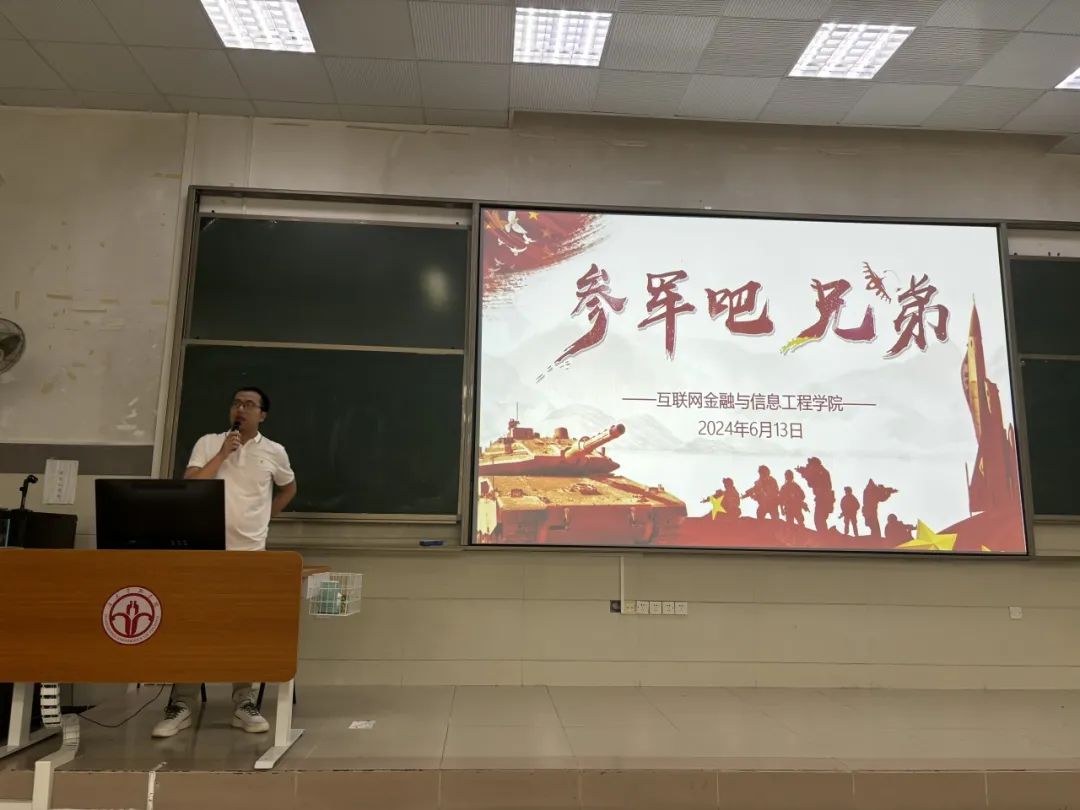 为深入贯彻落实习近平强军思想,进一步落实国家相关征兵工作要求,帮助老员工全面了解征兵政策,激发应征入伍热情,2024年6月15日下午“2024年度老员工应征入伍宣讲会”在北教学楼102阶梯教室举办,公司党委副书记蔡秋华,校征兵办专干老师肖军,公司辅导员钟培权、周亚辉,以及退役员工代表蔡依苗出席本次宣讲会。