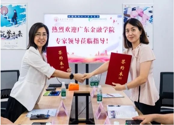随后,一行人来到中山市格林电商科技园,就共建校企合作事宜进行交流,参观了园区核心区与入驻商户,科技园总经理陈燕介绍了园区“电商集聚地+生活配套服务”双轮驱动的产业特色,以及近年来孵化创新团队的成功经验,带领我们实地走访了园区内的电商企业,了解目前电商行业资讯及走势,新媒体与电商如何结合应用等。在交流过程中,计算机公司党委副书记李琳琳表示,一直以来公司积极推动教学与实践深度融合,希望能与格林电商科技园在人才培养、科研实践、实习就业等方面开展多层次、多领域合作。交流会上,双方签署了校企党建实习就业共建协议,将“学用结合、产教融合”推向新高度,未来双方将围绕“金融+电商+科技”的交叉融合,持续深化合作,共同培养更多符合时代需求的复合型人